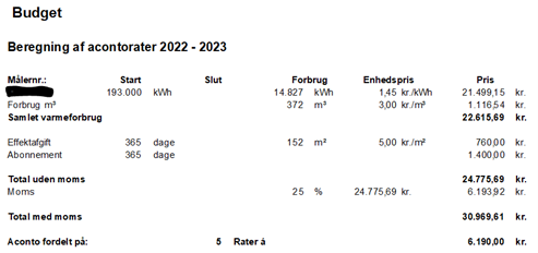 Her bliver indefrysningsbeløbet for et helt år(bruttobeløbet) 30.969,61/14.827 => 2,09 kr./kWh. minus 1,44 kr./kWh => 0,65 kr./kWh gange 14.827 = 9.637,55 kr. for hele året.